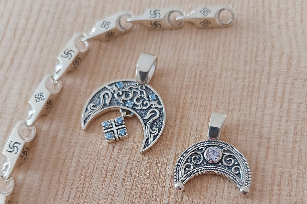 Подвески Обереги Лунница и браслет с символами Даждьбог и Символ Рода